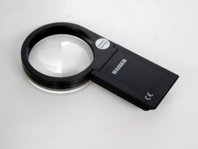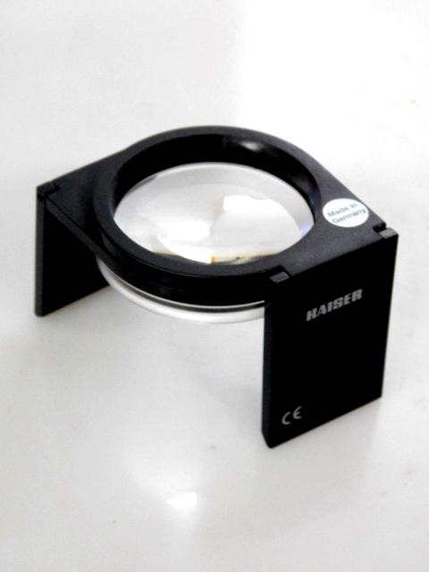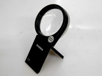 A functionally designed magnifier that can be used as a hand-held reading glass or as a desk-top magnifier with base for vertical or inclined viewing.
